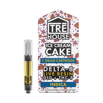 Rest assured, Ice Cream Cake TRE House upholds the highest standards of quality and potency. Each cartridge undergoes meticulous testing to ensure purity, consistency, and a vape experience that you can trust.Embark on an extraordinary vaping journey with the TRE House Live Resin Delta 8 + D10 + THC-P Vape Cartridge in the convenient 1G size. Let the fusion of cannabinoids ignite your senses, as you delve into a world of intense flavors and exhilarating effects. Elevate your vaping sessions to new dimensions and savor the unmatched satisfaction that awaits you.TRE House Live Resin Delta 8 + D10 + THC-P Vape Cartridge 1G Features and Specifications:• Capacity: 1g (1000mg) • Cannabinoid: THC-P, Live Resin, Delta 8, Delta 10 • Warning: May cause psychotropic effect • 2018 Farm Bill Compliant • 3rd Party Lab Tested • Zero additives• Made in USA